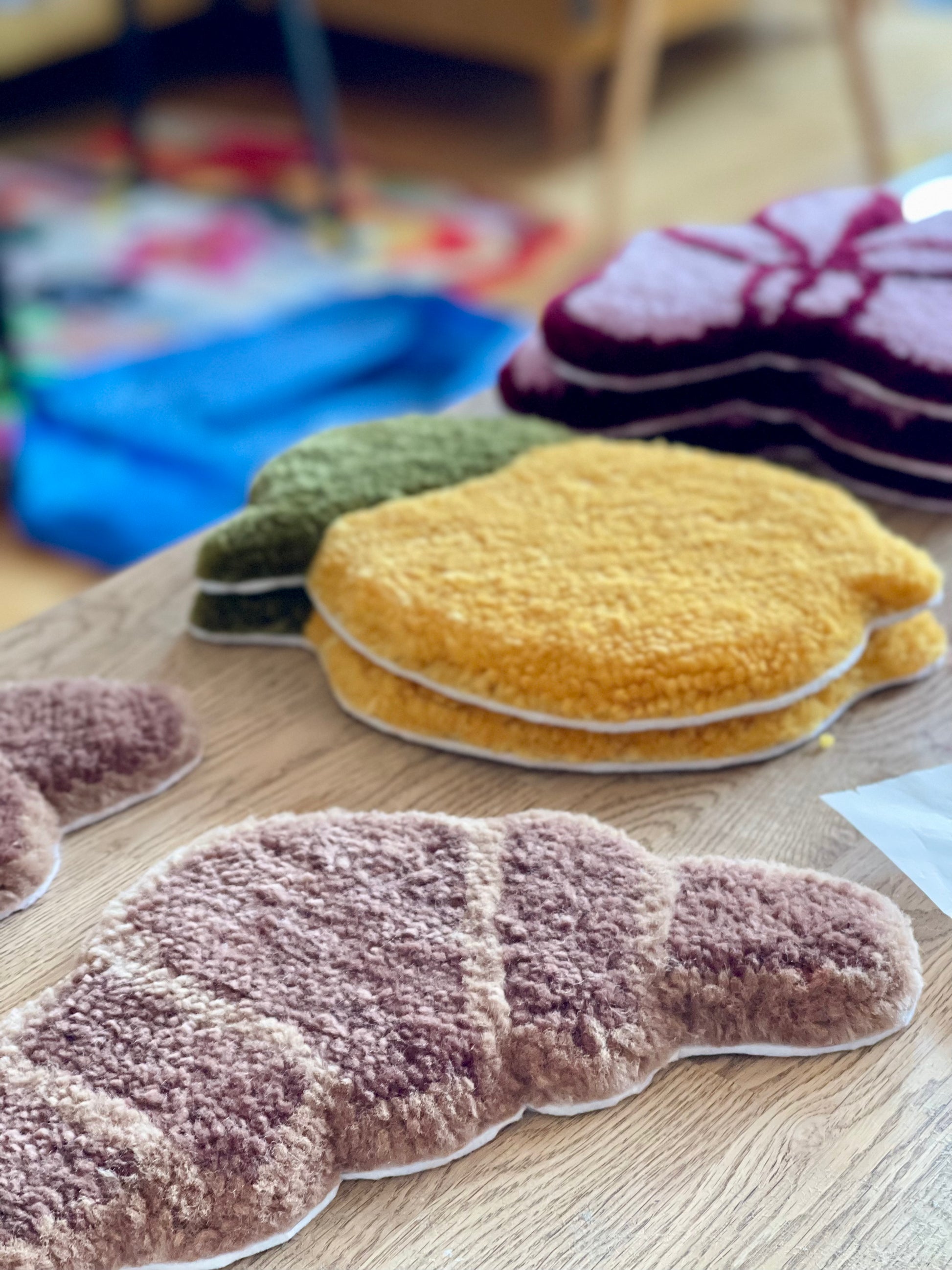 Disse bløde tæpper er tuftede i hånden og fortæller hver sin historie. Jeg glædes over at tufte disse unikke værker til dig, så de kan pryde dit hjem. Hvert et tuft er lavet med kærlighed til håndværket. Alle værker er lavet i 100% uld fra Drops. Bagside er filt, som også er uld.